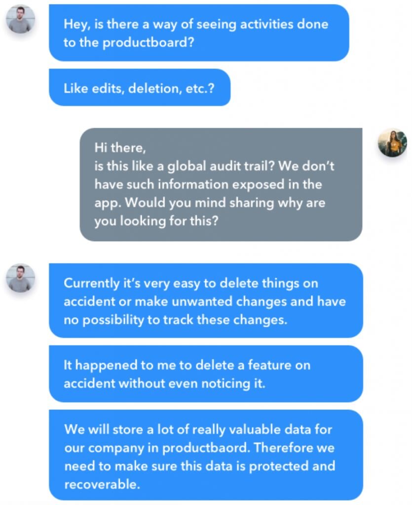 If we had built what he initially asked for, an activity logging feature, we might have delivered something that he didn’t actually need! Instead, by going past his initial ask, we discovered that what he needed was a way to safeguard his data. This discovery isn’t only important to get to the right solution, but by tracking his need, we can brainstorm broader opportunities, such as around data retention, that would solve this need as well.